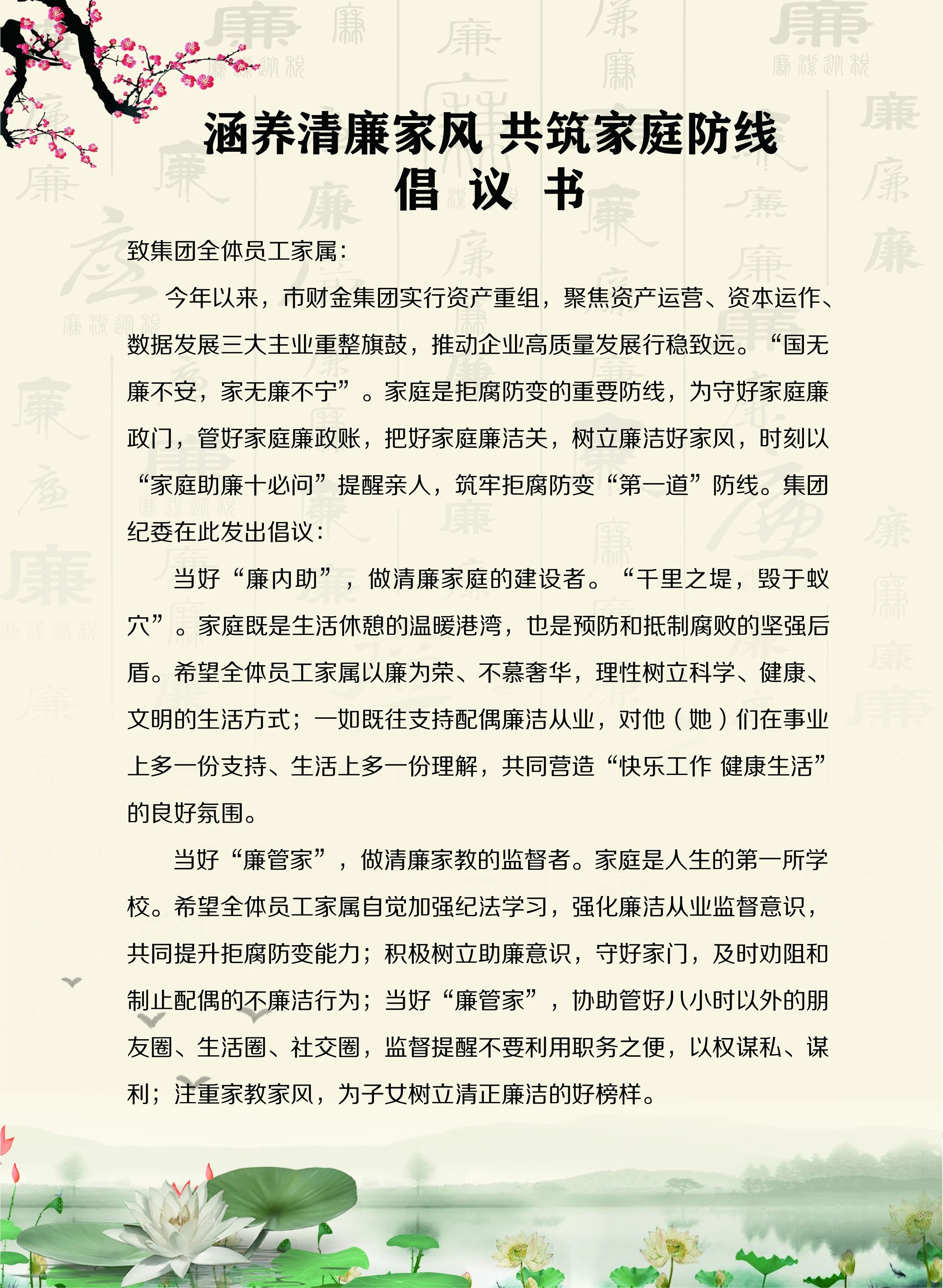 为进一步加强集团员工清廉家风建设,以优良家风助推集团政治生态清正明朗,10月30日下午,集团纪委邀请12名重点岗位员工家属,召开了以“涵养清廉家风 共筑家庭防线”为主题的家庭助廉座谈会。 座谈会上,集团纪委为每位员工家...