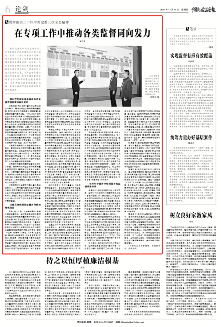 2024年11月14日,《中国纪检监察报》论剑版、中央纪委国家监委网站要闻刊发山东省委常委、省纪委书记、省监委主任夏红民署名文章《在专项工作中推动各类监督同向发力》。全文如下在专项工作中推动各类监督同向发力 山东省...
