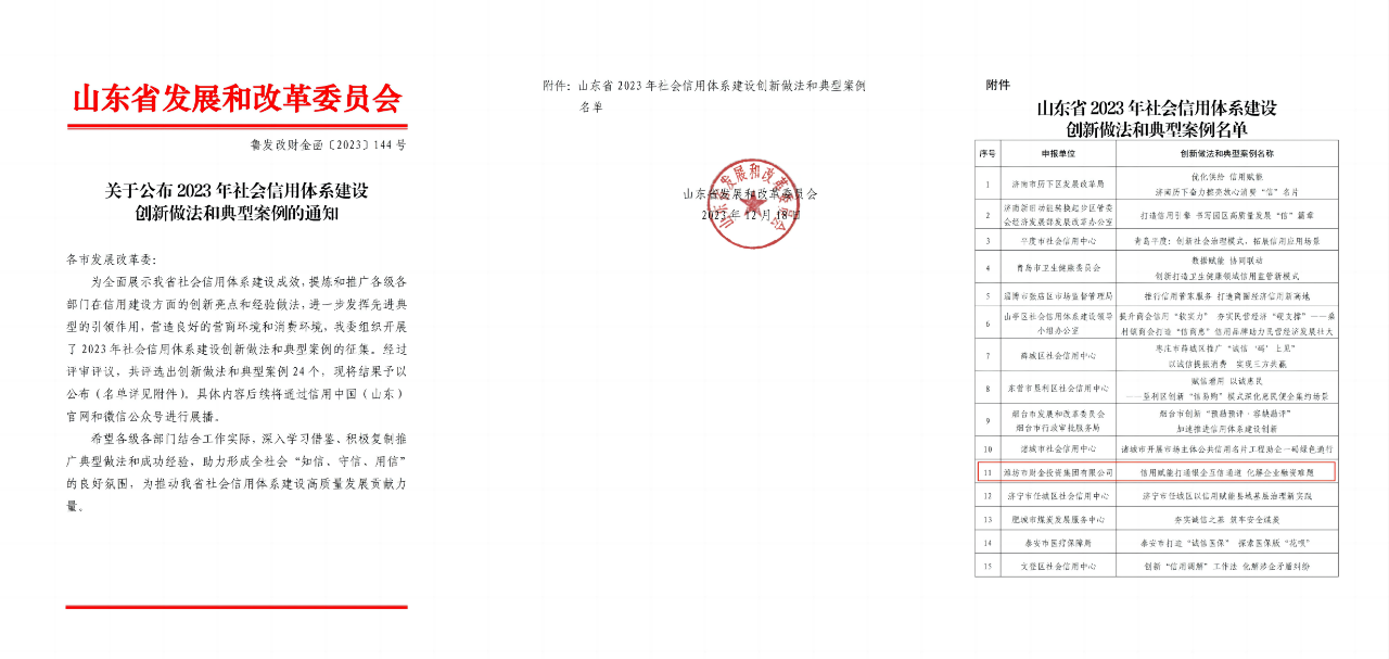 近日,省发改委发布《关于公布2023年社会信用体系建设创新做法和典型案例的通知》,市财金集团报送的《信用赋能打通银企互信通道 化解企业融资难题》成功入选。这是该案例在第五届中国城市信用建设高峰论坛上成功获评“全国优秀信用...