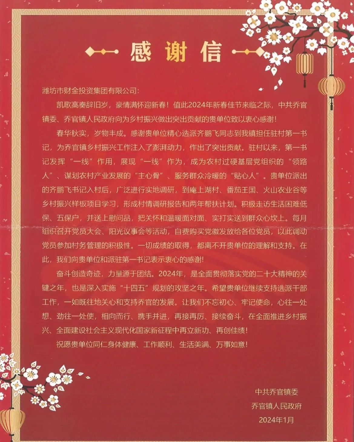 1月23日,市财金集团收到昌乐县乔官镇委、镇人民政府送来的感谢信,对潍坊市财金集团在乡村振兴中做出的突出贡献表示衷心感谢。市财金集团高度重视乡村振兴工作,对驻村帮扶工作队选派年富力强的第一书记,并给予全力支持。第一书记与...